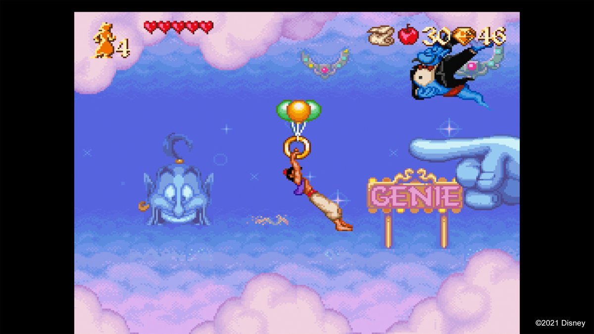 Further, it’s simply enjoyable to see different takes on locations common to both versions. The Agrabah marketplace and rooftops, the Cave of Wonders, inside the lamp, and Jafar’s Palace all are stages that are familiar but different. Gem collecting makes for some replayability with alternate endings. First-rate stuff.